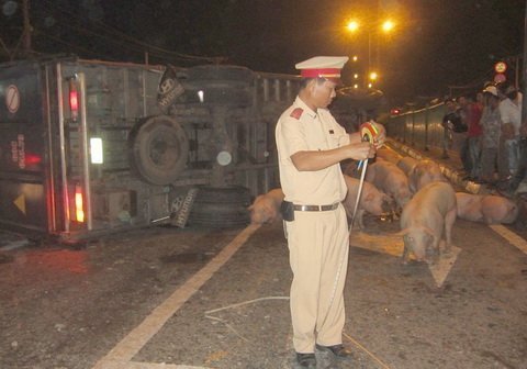 | CSGT xử lý tai nạn và chuyển đàn heo đi nơi khác. |