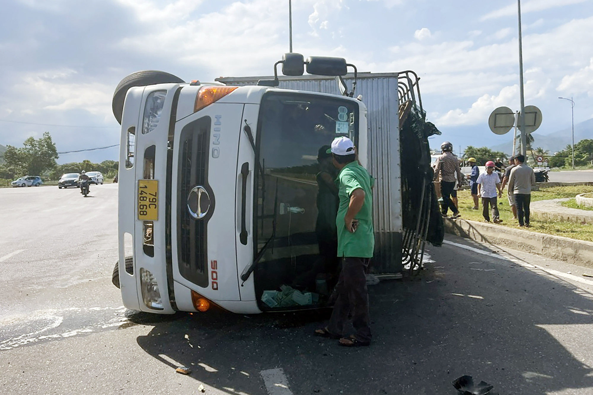 Chiều 17/9, xe tải biển số Khánh Hòa chạy trên đường Võ Nguyên Giáp, hướng huyện Diên Khánh về trung tâm thành phố. Khi qua xã Vĩnh Thái (TP Nha Trang), xe bất ngờ loạng choạng, lật nghiêng.