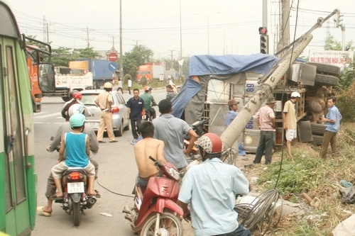 Chiếc xe tải loại 15 tấn chở đầy phân bón đổ dốc cầu vượt Linh Xuân (P. Linh
