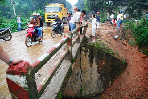 | Đến 10 giờ sáng nay (5/5), đường vẫn chưa thông, đoàn xe nằm chờ ở hai bên đầu cầu Hùng Xuân, thuộc xã Xuân Giao, huyện Bảo Thắng (Lào Cai) kéo dài vài cây số. |