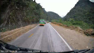 Tại đoạn đường đèo Thung Khe đang sửa chữa, bất ngờ chiếc xe tải đi sau xe buýt lấn trái lao lên, vượt cắt mặt luôn ô tô ngược chiều.