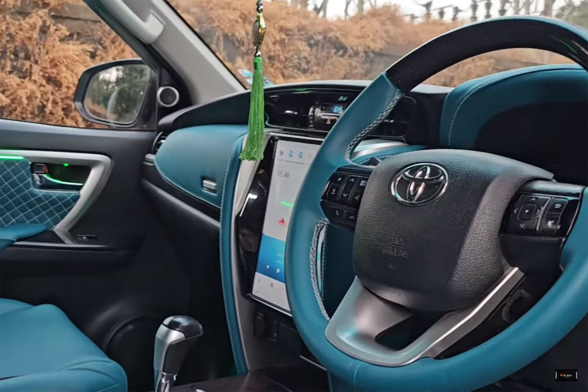 Bên trong, thật khó để biến phong cách nội thất thể thao của Lamborghini Urus lên chiếc Fortuner này. Tuy nhiên, chủ xe đã quyết định hoàn thiện khoang nội thất bằng cách bọc lại các vị trí da trên ghế ngồi, ốp trang trí bảng táp lô và vô lăng thành màu xanh ngọc. Thảm sàn của chiếc SUV đặc biệt này cũng được hoàn thiện cùng màu.