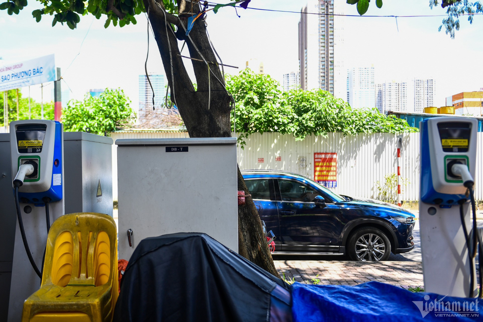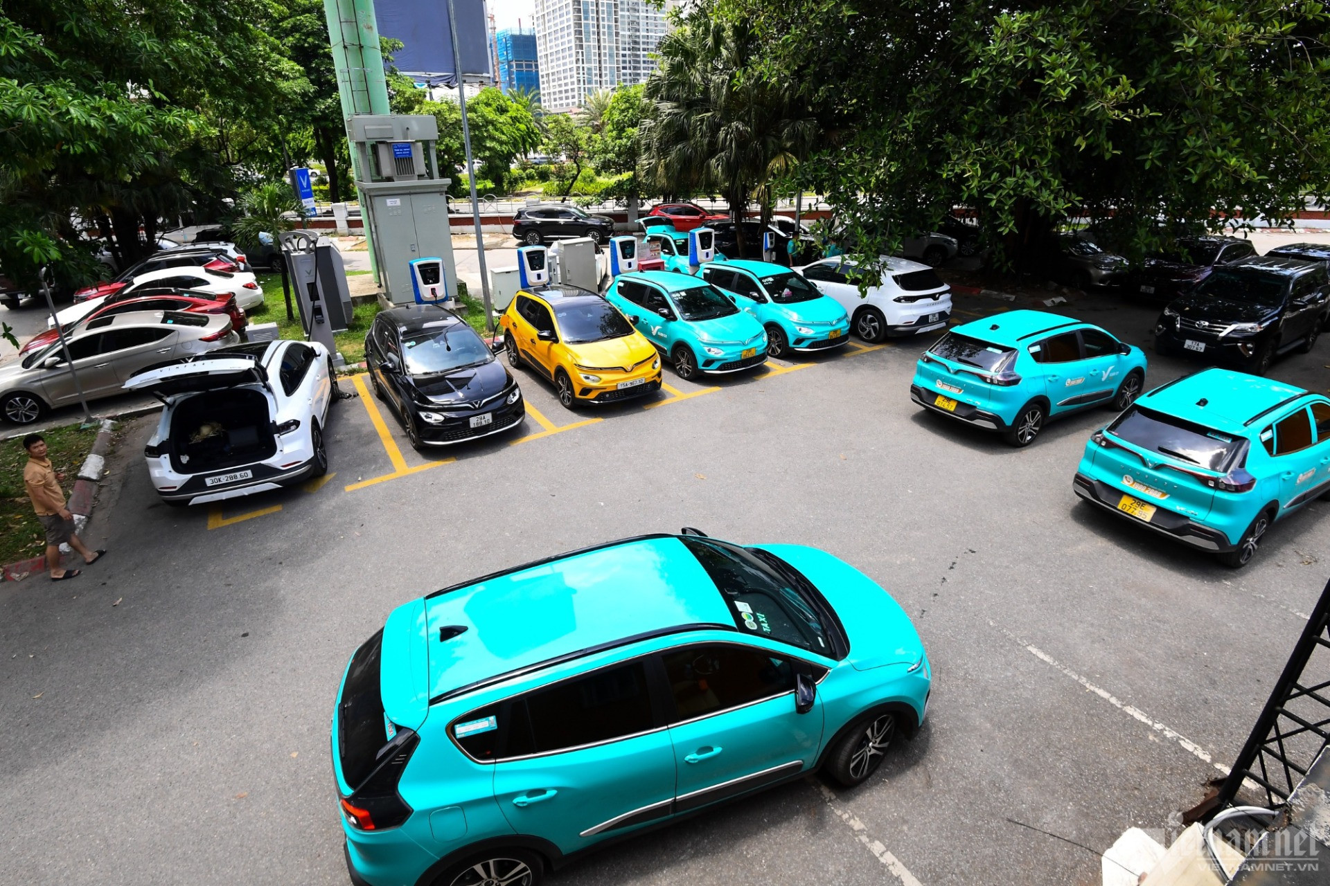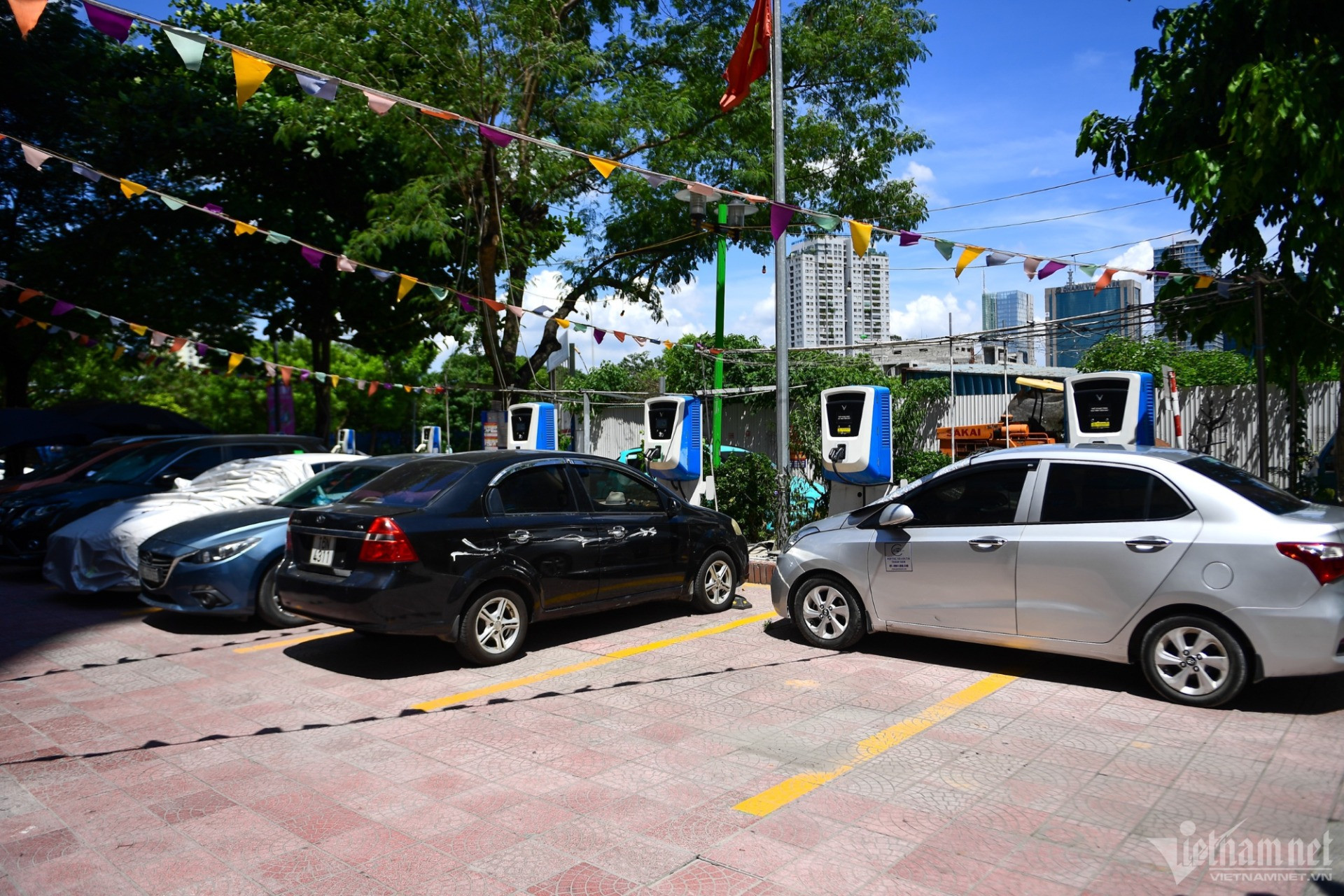 Điểm sạc xe điện tại Khu đô thị Times City luôn trong xếp kín xe. Nhiều tài xế taxi điện vào đây chờ sạc.