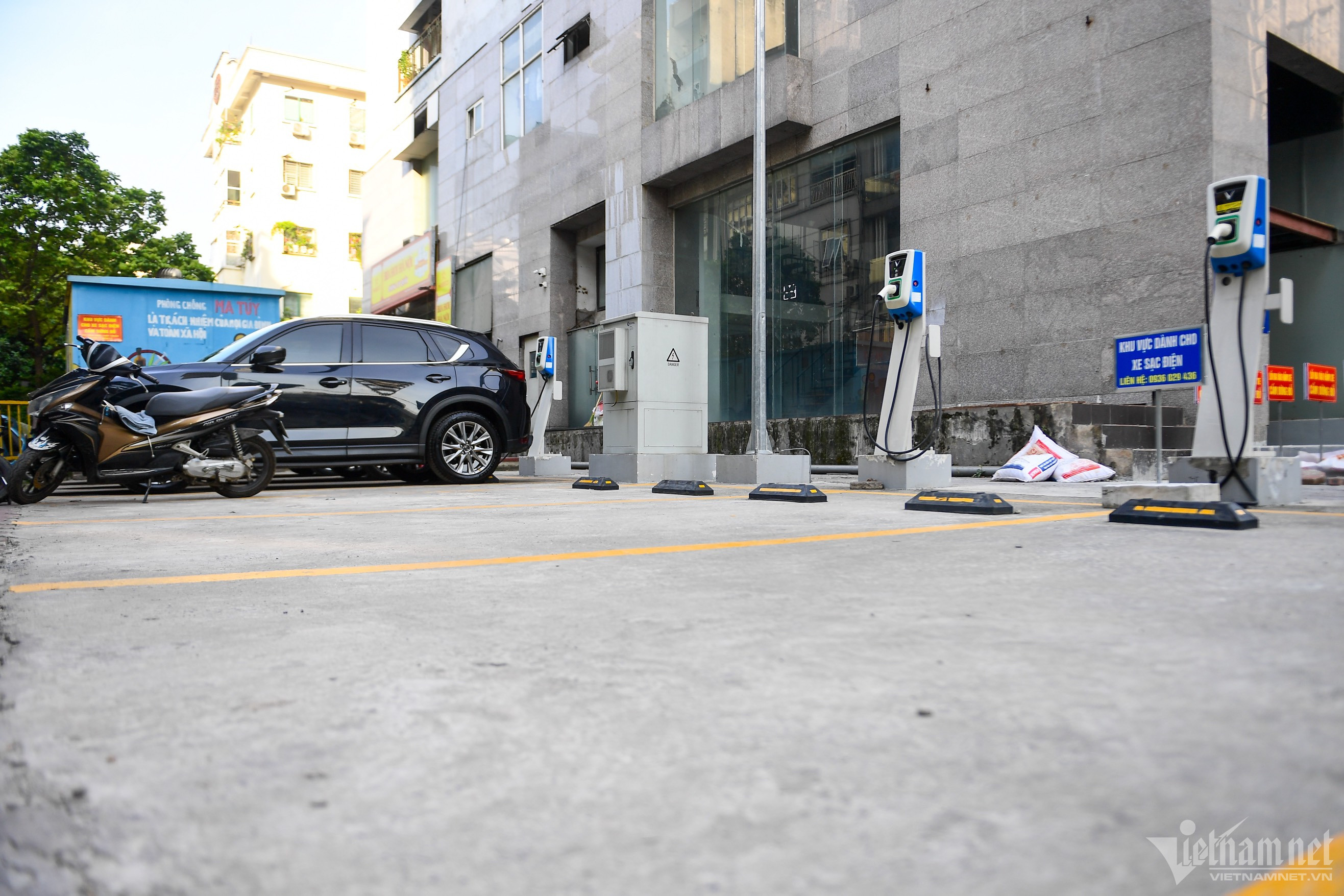 Vị trí đặt trạm sạc ô tô điện tại chung cư Xuân Mai Complex (quận Hà Đông) hàng ngày bị nhiều xe xăng chiếm chỗ.