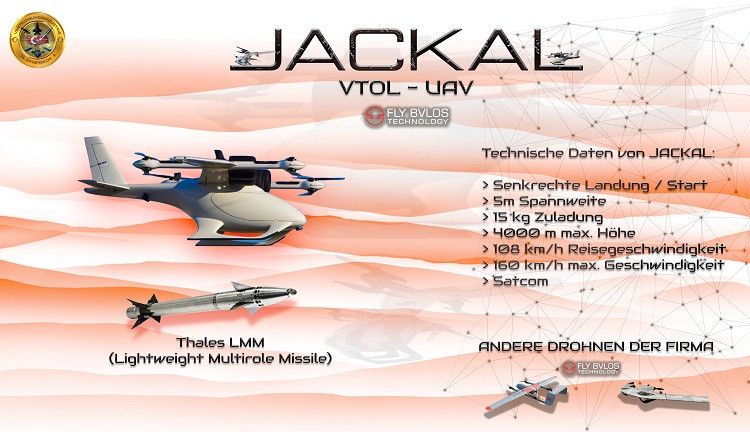 Giám đốc công ty chế tạo UAV quân sự Flyby Technology, ông Jon Parker cho hay, JACKAL được lên ý tưởng từ những kinh nghiệm thực chiến của bản thân ông, một cựu phi công thuộc Không quân Anh, và các đồng nghiệp.