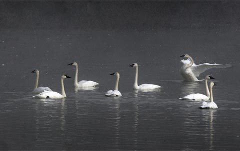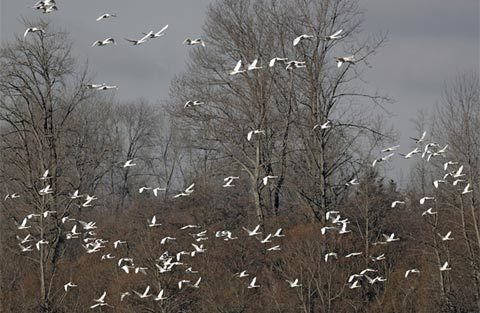 Đàn thiên nga Cygnus buccinator bay trên sông Skagit. Ảnh: pbase.com