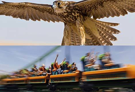 Tàu lượn siêu tốc Kingda Ka Rollercoaster – một trong những tàu lượn “rùng rợn” nhất thế giới - ở công viên giải trí Six Flags Great Adventure (bang New Jersey, Mỹ) giữ kỷ lục là chiếc tàu lượn siêu tốc nhanh nhất và cao nhất trên thế giới vào thời điểm khánh thành tháng 5/2005. Tuy nhiên, nếu bạn cảm thấy tàu lượn này chưa cho bạn cảm giác đủ mạnh thì bạn có thể “xin quá giang” trên lưng chim ưng peregrine. So với chim ưng peregrine thì tốc độ của tàu lượn Kingda Ka “chẳng thấm vào đâu”.
