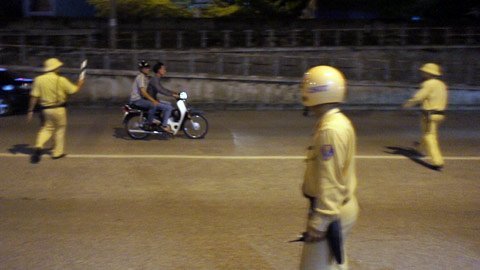 | Số khác thì dừng xe nhưng lại là người... trong ngành (Trong ảnh là 2 người từ quán nhậu đi ra xưng là công an quận Hoàn Kiếm đang đi làm...nhiệm vụ???) |