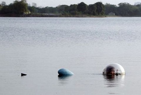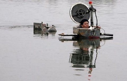 Nhà phát minh nghiệp dư Tao Xianglo đã thử nghiệm tàu ngầm tự chế tại một hồ nước ngoại ô thủ đô Bắc Kinh. Từ một chiếc thùng phuy và các dụng cụ mua được ở chợ đồ cũ , Tao (34 tuổi) đã làm ra một chiếc tàu ngầm đầy đủ chức năng như kính tiềm vọng, động cơ điện, áp kế và hai cánh quạt...Anh mất hai năm và 30.000 NDT để phát minh và thử nghiệm công trình của mình. (Ảnh: Reuters)