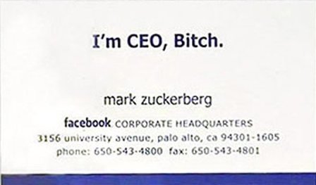 Nhìn danh thiếp của người sang lập Facebook người ta có thể thấy một điều rằng khi bạn là ông chủ bạn có thể viết bất cứ thứ gì lên tấm danh thiếp của mình, không cần quan tâm xem người khác nghĩ sao. Mặc dù là một tỷ phú nhưng Mark Zuckerberg có phong cách rất bình di, có lẽ cũng vì thế anh ghi lên danh thiếp của mình một từ cũng hết sức “bình dị” trong cuộc sống.