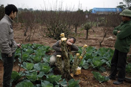 Gặp anh Thế Anh – người có 3 đời trồng đào Nhật Tân vào một chiều cuối năm Nhâm Thìn trên vườn đào có diện tích hơn 1ha ngoài bãi sông Hồng. Anh Thế Anh hồ hời khoe vừa hạ thổ được mấy chục gốc đào rừng xuống vườn chuẩn bị “phối” với đào Nhật Tân.
