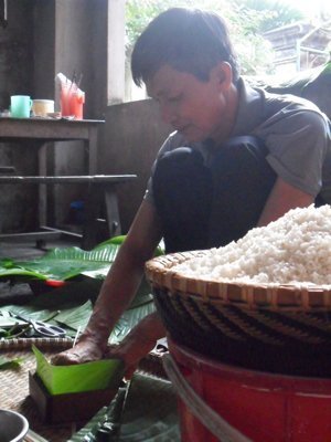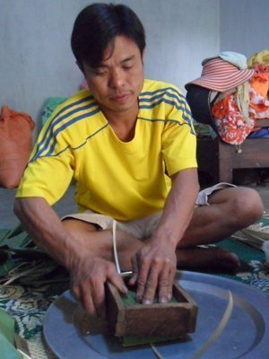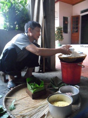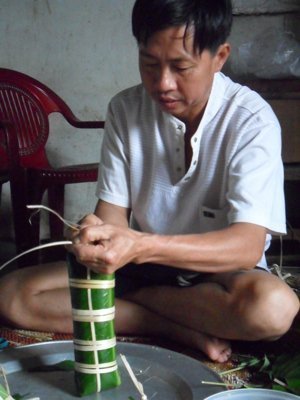 | Chăm chú gói bánh tét |