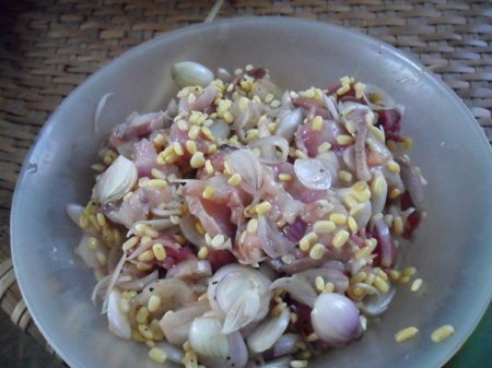 | Thịt mỡ, dưa hành, đậu xanh đã được trộn lẫn vào nhau |