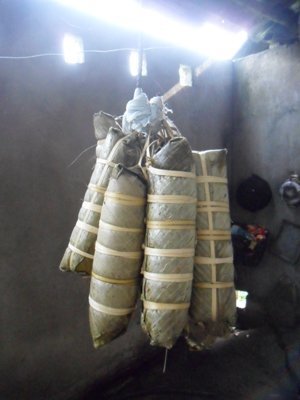 | Những chiếc bánh tét đã được luộc chín, treo trên gác bếp |