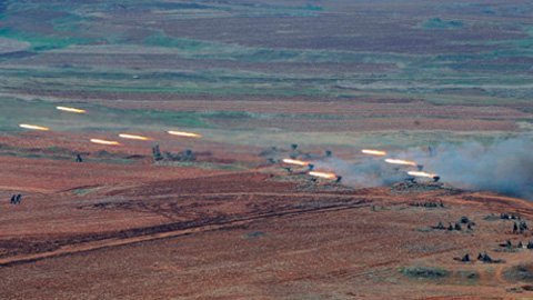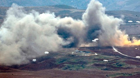 một vụ tập trận bắn đạn thật của Bình Nhưỡng bao gồm các xe tăng, máy bay và pháo các