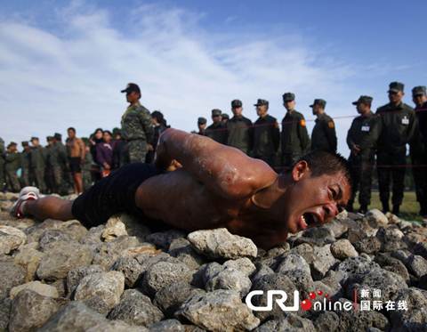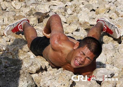 Trong buổi tập, các binh sỹ sẽ phải trải qua màn tập luyện “người ếch”. Mỗi người sẽ phải cởi trần và trườn qua đống đá lởm chởm dài chừng 50 m. Đây quả là một thách thức không đơn giản chút nào đối với các binh sỹ.