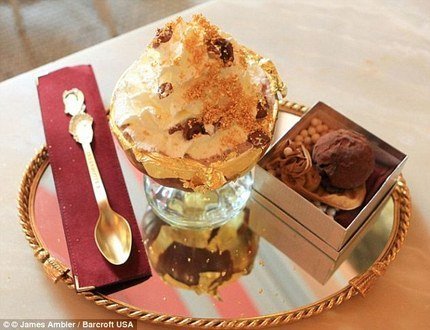 | Món tráng miệng được trang trí bằng vàng lá và có viên kim cương trên đỉnh bánh |