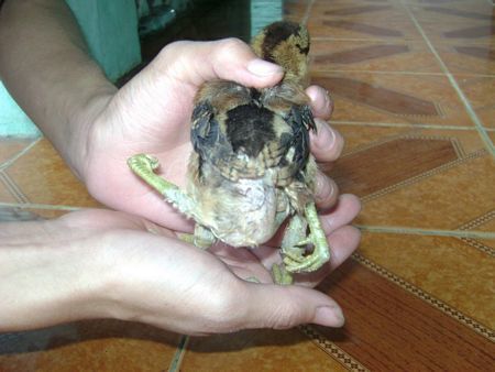 Kỳ lạ là chú gà này lớn rất nhanh và có hai hậu môn đều có chức năng như nhau, chú gà này có 1 cặp chân quặp về phía trước, 1 cặp chân quặp về phía sau.