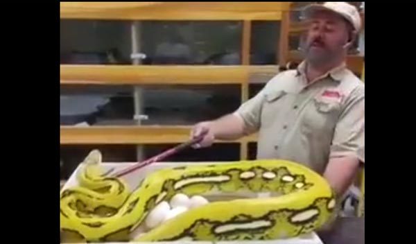 Trong một đoạn video mới chia sẻ trên Instagram, Jay Brewer, người sáng lập Prehistoric Pets, một cửa hàng chuyên doanh trăn, rắn, thằn lằn và các loài bò sát khác, đã có màn trổ tài khiến người xem thót tim. Vì mục đích gây giống khỏe mạnh, anh Brewer phải di dời ổ trứng trăn khỏi mẹ của chúng và cho vào một thùng ấp riêng. Song, đây là công việc nguy hiểm, đòi hỏi người thực hiện phải rất khéo léo, công phu trước sự dè chừng và chống trả hung hãn của trăn mẹ.