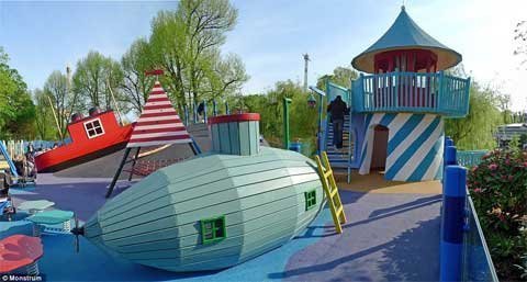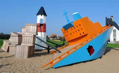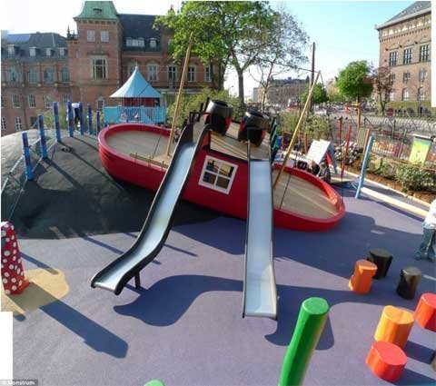 Thoạt nhìn, những món đồ màu sắc sặc sỡ ở sân chơi giống như nó vừa thoát ra từ những trang sách của Dr.Seuss. Song, những món đồ chơi tuyệt vời này là con đẻ của nhà thiết kế sân chơi người Đan Mạch Ole B. Nielsen và Christian Jensen.