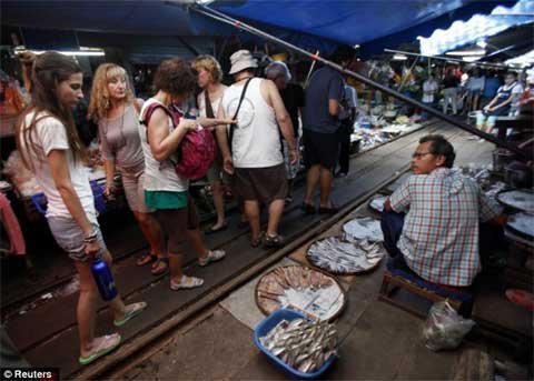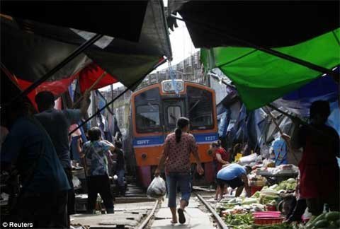 Tám lần một ngày, tàu hỏa phải luồn lách qua một khu chợ đầy các