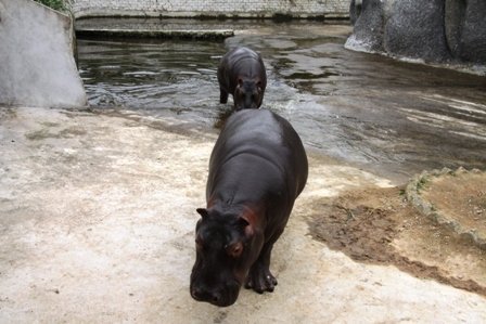 cặp hà mã vừa tắm nước thủng thẳng đi đến chỗ máng thức ăn.