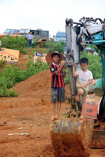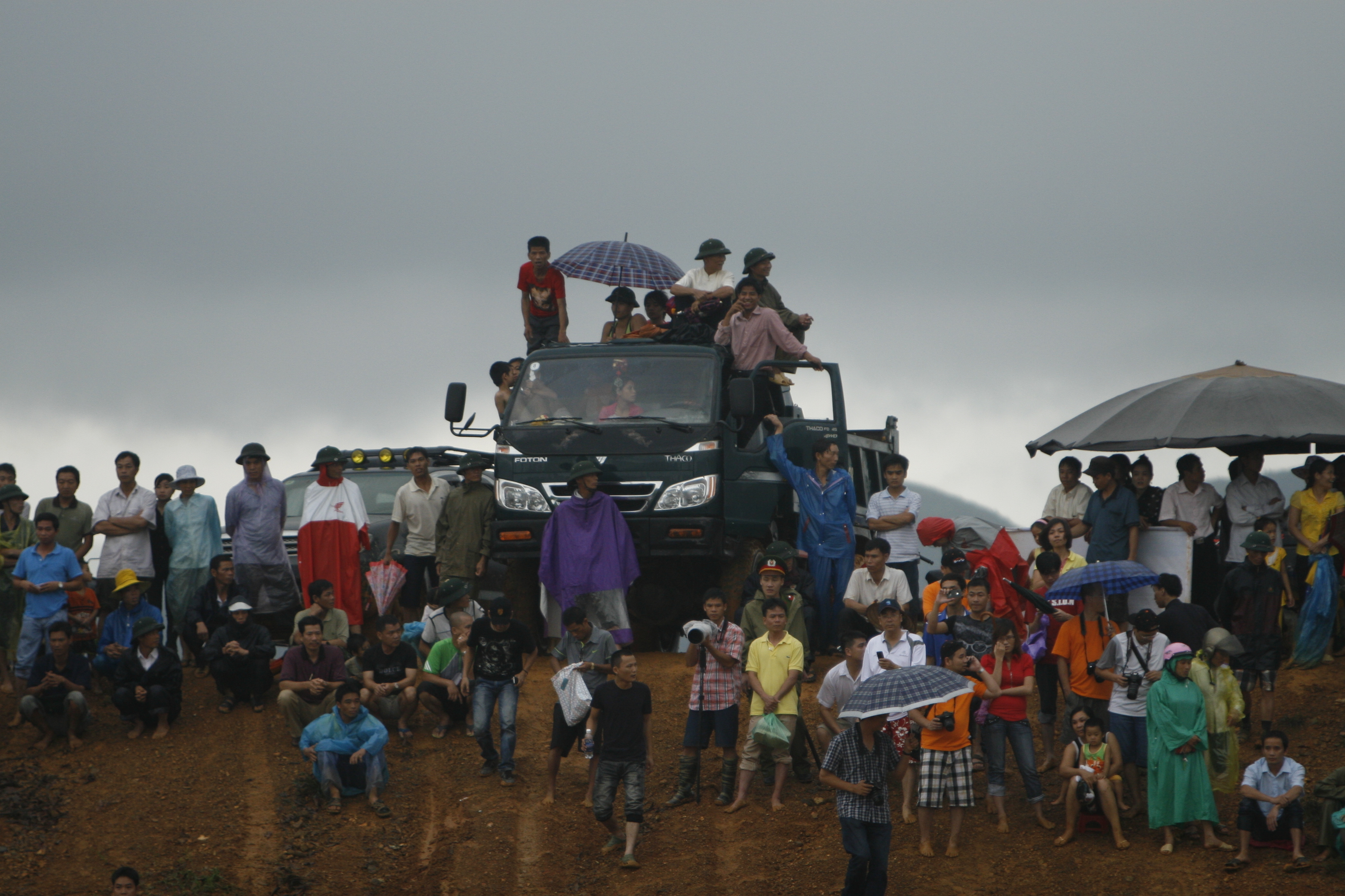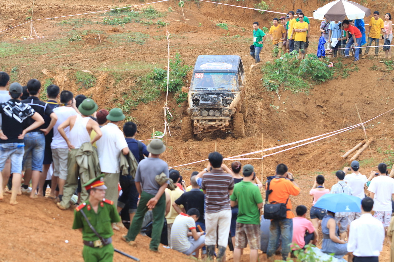 - Có lẽ, chỉ ở Việt Nam mới có được phong cách xem lái ô tô địa hình rất độc đáo thế này. Phía dưới đường thi, các tay lái vượt dốc, bay qua hố để thể hiện đẳng cấp, phía trên gò cao, người dân cũng “offroad” để xem và cổ vũ.