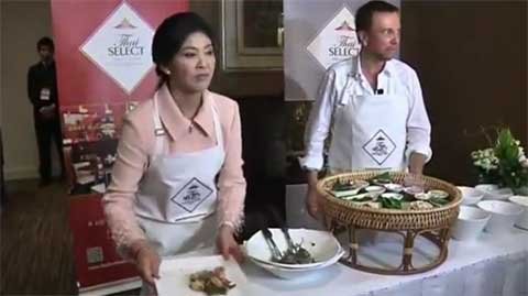 Trước một nhóm khách mời và quan chức, nữ Thủ tướng xinh đẹp của Thái đã cùng đầu bếp ngôi sao David Thomson chuẩn bị món salad đu đủ.