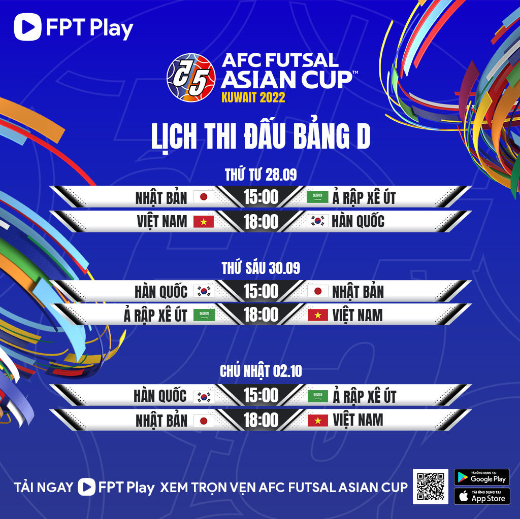 Cuộc đọ sức giữa ĐT Futsal Việt Nam với đối thủ Ả Rập Xê Út sẽ diễn ra vào 18h ngày 30/9. Sau đó, trận đấu cuối cùng tại vòng bảng của ĐT Futsal Việt Nam sẽ là màn chạm trán đối thủ nhiều duyên nợ ĐT Futsal Nhật Bản vào 18h ngày 2/10.