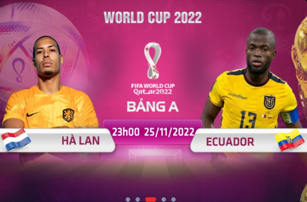 Hôm nay (25/11) trận đấu giữa Hà Lan và Ecuador ở bảng A World Cup 2022 sẽ diễn ra vào lúc 23h00 theo giờ Việt Nam. Người hâm mộ bóng đá Việt Nam có thể xem trực tiếp trên VTV2 và VTV Cần Thơ.