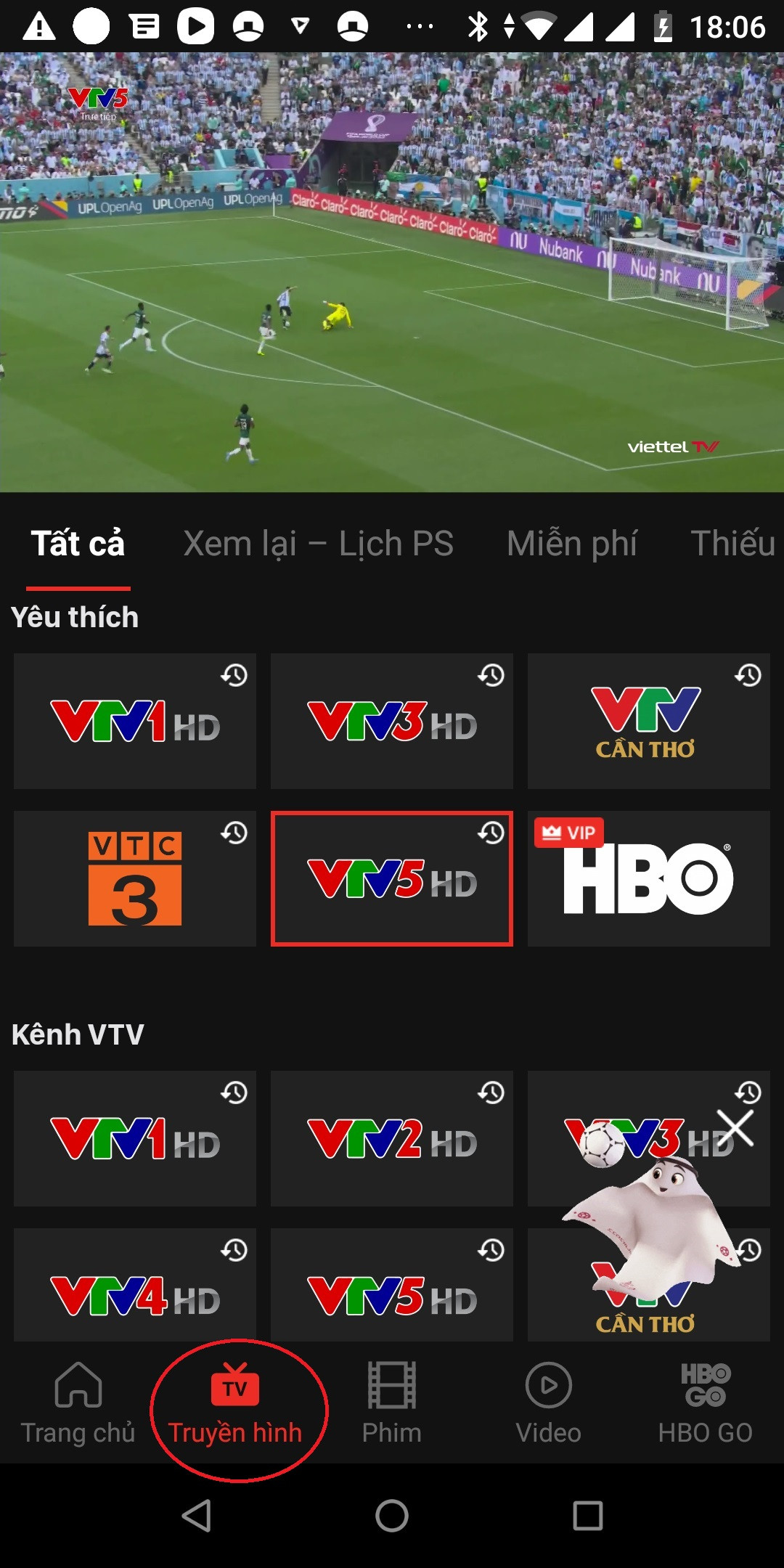Trong mùa World Cup, giao diện chính các ứng dụng thường có chỉ dẫn ngay đến kênh đang phát trực tiếp trận đấu. Người hâm mộ cũng có thể vào mục "Truyền hình" hoặc tương tự để tìm các kênh VTV.