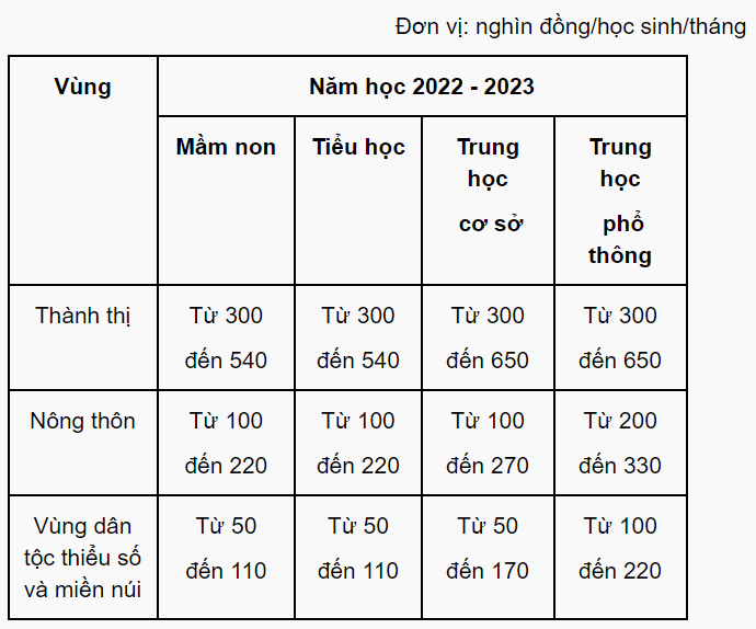 Học phí năm học 2022 – 2023 của trường mầm non, phổ thông công lập chưa tự bảo đảm chi thường xuyên được chia theo vùng với mức cao nhất mỗi tháng 650 nghìn đồng/học sinh.
