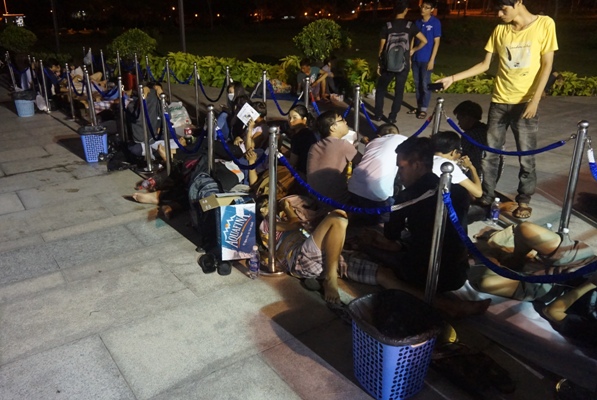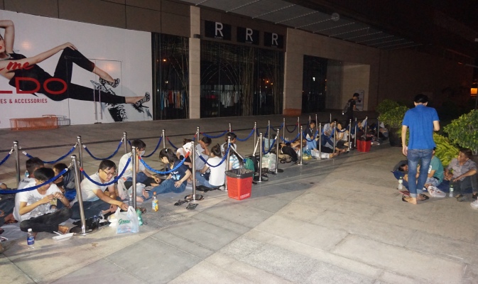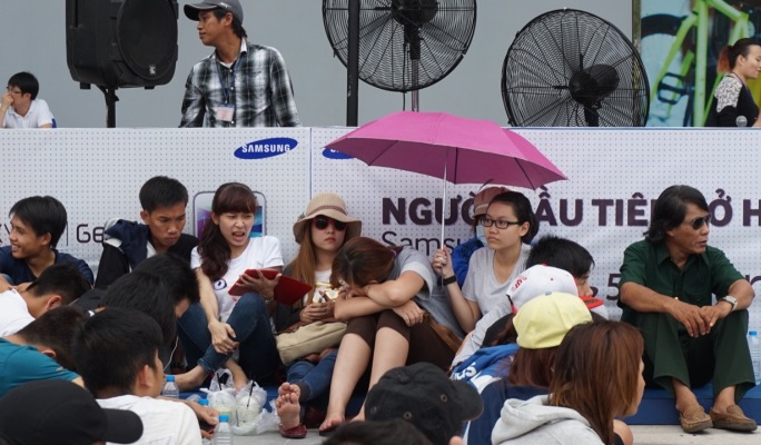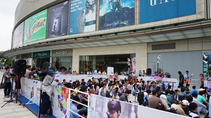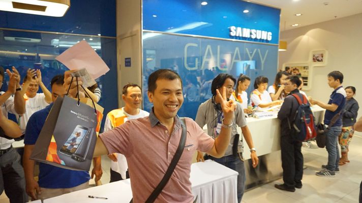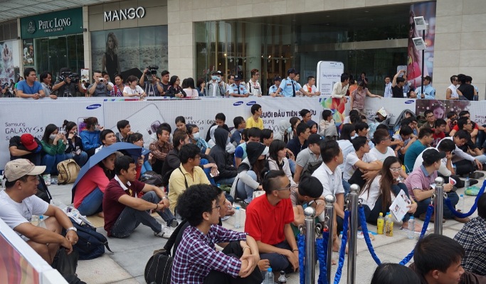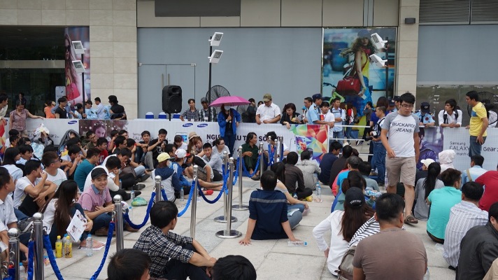 Mặc dù, phải 11h00 trưa 11/4 Samsung mới chính thức mở bán ở các địa điểm, nhưng ngay từ đêm qua đã có cả trăm người tại TP.HCM xếp hàng để chờ mua sản phẩm này và họ tiến hành qua đêm ngay tại sân của cửa hàng SES Crescent Mall.