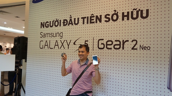 Và người đầu tiên mua được chiếc Galaxy S5 và Gear 2 Neo là anh Nguyễn Văn Hậu, anh xếp hàng từ 3 giờ sáng, anh cho biết mình mua sản phẩm này vì thích các tính năng như camera, theo dõi sức khoẻ và cảm biến vân tay trên máy.
