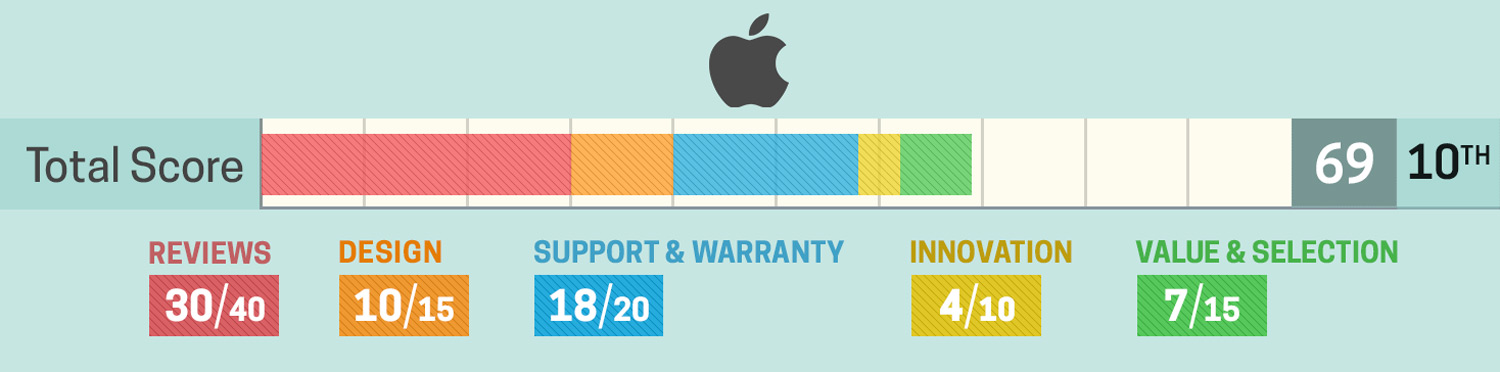 Trong nhóm thương hiệu dưới cùng của bảng xếp hạng, nổi bật hai cái tên Samsung và Apple. Các tín đồ của Táo khuyết có lẽ cũng phải ngạc nhiên bởi phong độ sa sút những năm gần đây. Tụt xuống vị trí thứ 10 đạt 69 điểm, Apple thực sự rơi vào tình trạng đáng báo động khi họ thậm chí còn xếp dưới cả Huawei. Tên tuổi đến sau ở thị trường laptop nhưng năm nay đạt 70 điểm, vừa đủ để vượt công ty Mỹ. Apple bị phàn nàn rất nhiều về lỗi bàn phím cánh bướm, sản phẩm quá ít đổi mới cứ lặp đi lặp lại nhàm chán. Dường như MacBook không còn gì để tự hào với các đối thủ cùng phân khúc nữa! Chấm điểm Đổi mới, hãng đạt 4/10 và mục Giá trị 7/15, cả hai đều thấp nhất cả bảng.
