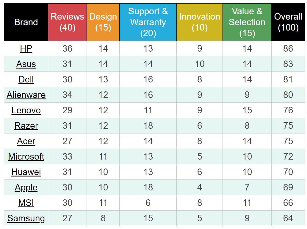 Được công bố bởi Laptop Mag, chuyên trang đánh giá laptop của Mỹ, bảng xếp hạng tiến hành chấm điểm 12 thương hiệu laptop hàng đầu. Với thang điểm 100 chia cho từng mục Đánh giá (tối đa 40 điểm), Thiết kế (tối đa 15 điểm), Hỗ trợ và Bảo hành (tối đa 20 điểm), Đổi mới (tối đa 10 điểm), Giá trị (tối đa 15 điểm), cung cấp cho chúng ta một cái nhìn đầy đủ và chi tiết về từng thương hiệu.