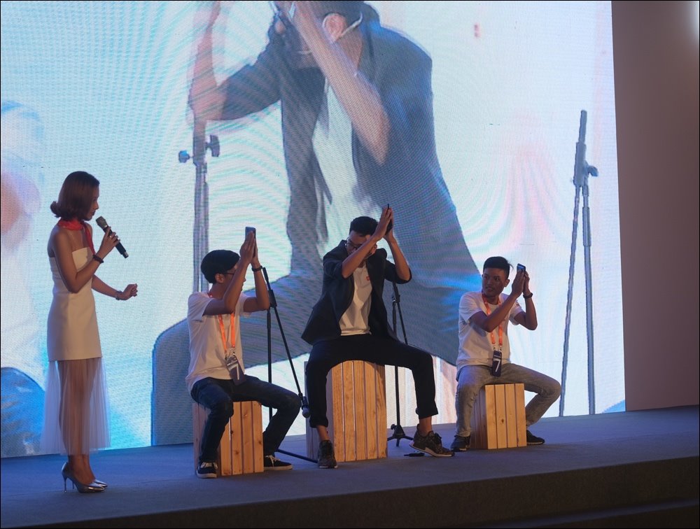 Ông Hoàng Tuấn Vũ, Phụ trách truyền thông Xiaomi Việt Nam, đang cùng hai Mi Fan dùng những chiếc Redmi Note 7 để đánh trống và gõ vào nhau để thử nghiệm độ bền. |