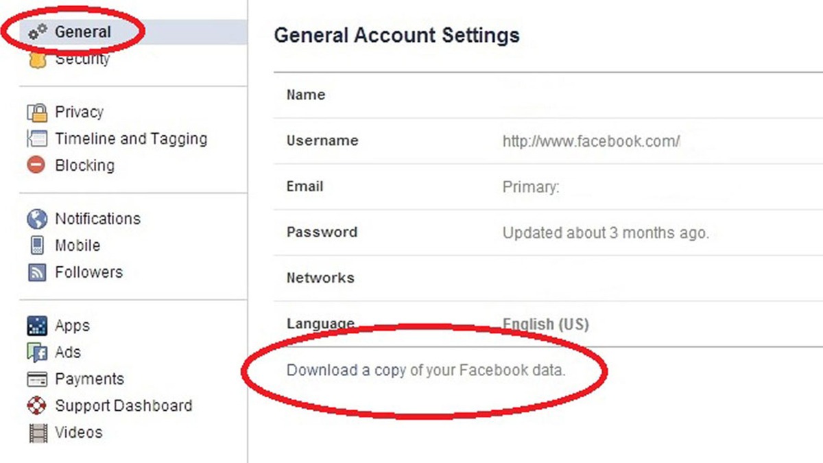 Trước tiên, bạn nên lưu ảnh, danh bạ, ngày sinh nhật và dữ liệu khác vì khi xóa tài khoản, chúng không lấy lại được nữa. Để làm điều này, bấm vào biểu tượng ổ khóa ở góc trên cùng bên phải màn hình, chọn See More Settings (Xem thiết lập khác) > General (Chung) > Download a copy of your Facebook data (Tải xuống bản sao dữ liệu Facebook). Sau khi tải xong file ZIP, lưu nó vào máy tính hoặc ổ cứng ngoài.