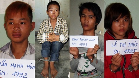 | 4 đối tượng trong băng cướp nhí bị bắt giữ (từ trái qua) gồm: Trần Mạnh Hùng, Nguyễn Văn Chung, Phạm Thành Nam và Lê Thị Thúy Kiều |