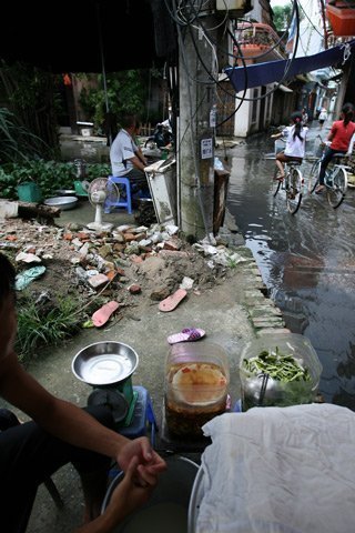 Cũng trong thời gian hơn một tháng nữa, người dân vẫn phải mua những đồ ăn như dưa, cà muối bày bán trong môi trường hôi thối này.