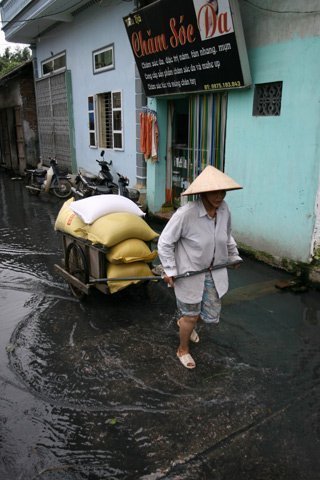 Lội trong dòng nước thải, hàng tấn gạo vẫn hàng ngày được người dân chở đến xưởng xay sát gạo để duy trì số lượng lớn bún cung cấp cho Hà Nội.