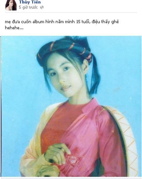 Thủy Tiên cho biết, đây là bức ảnh mà mẹ cô đã tìm thấy trong đống ảnh cũ của gia đình, hôm nay cô quyết định khoe với khán giả. Trong bức hình, Thủy Tiên trông khá ngây thơ, trong sáng và điệu đà trong bộ áo tứ thân. Đặc biệt, khuôn mặt Thủy Tiên rất thanh tú và gọn gàng.
