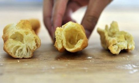 | Quẩy có nguyên liệu thông thường (ngoài cùng bên trái), quẩy có hỗn hợp bột mỳ, bột giặt và bột nổi rỗng ruột, quẩy từ bột mỳ và bột giặt (ngoài cùng bên phải) khô khốc, ruột đặc. |