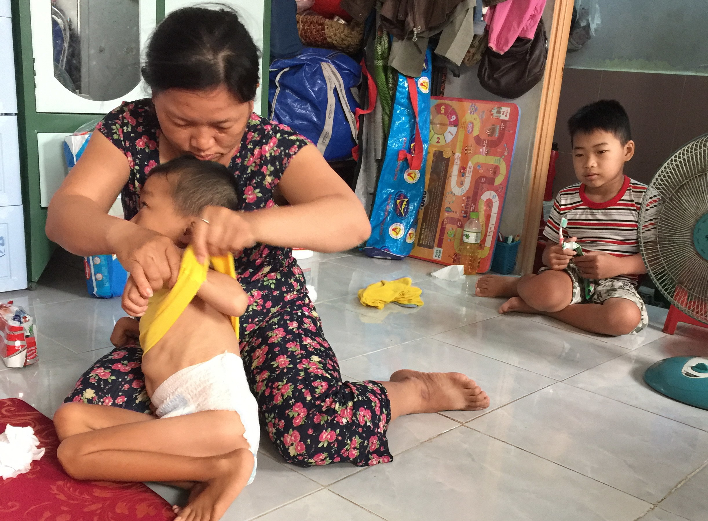 Sinh ra bình thường như bao đứa trẻ khác nhưng đến tháng thứ 6, sau một lần bệnh, tay chân Quí bắt đầu teo tóp. Người Quí cứng ngắc. Chị Nguyệt đưa con đi khám nhiều nơi, chạy chữa nhiều chỗ nhưng vẫn không thuyên giảm.