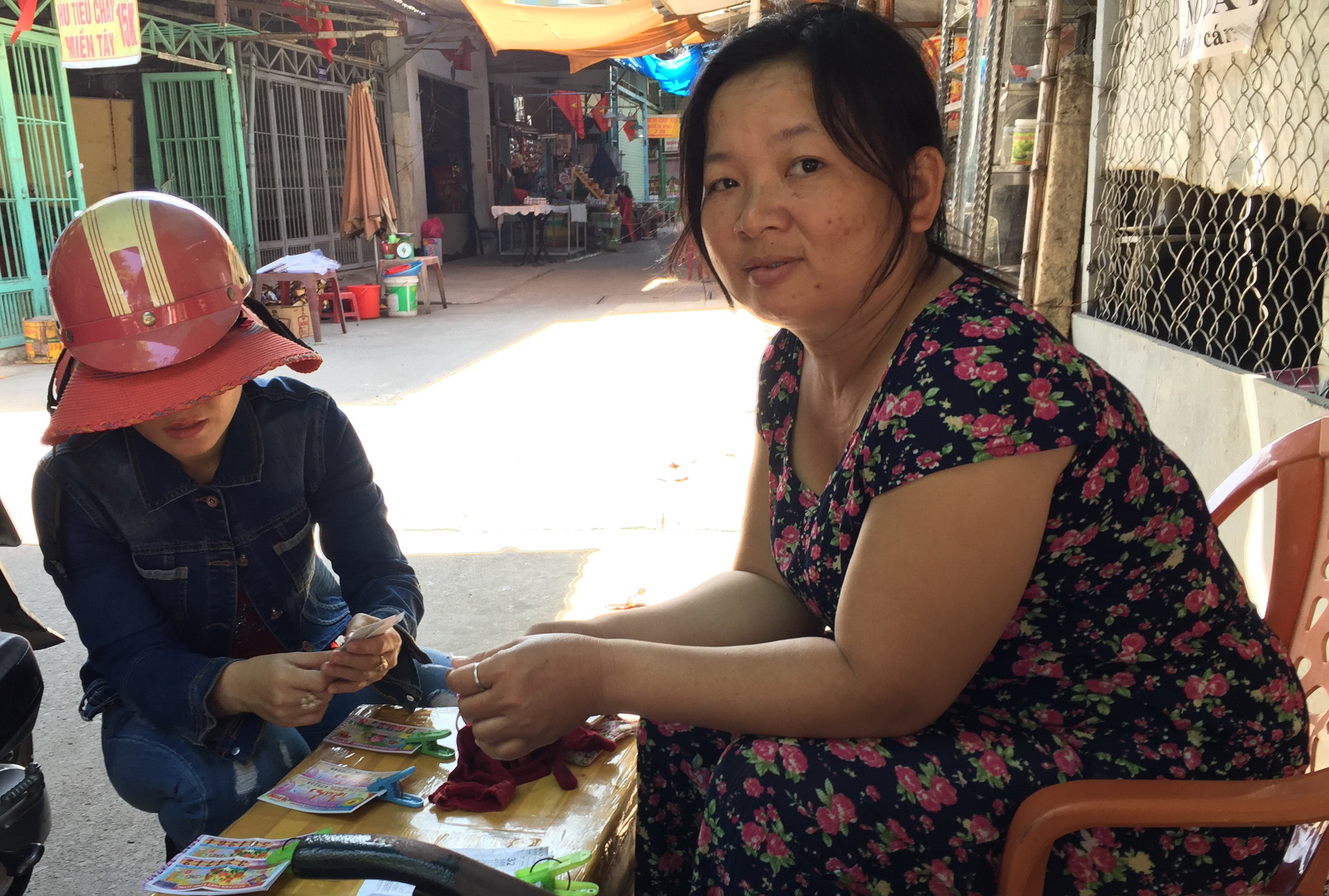 Chị là Lê Thị Bích Nguyệt (40 tuổi) và đứa bé là Lê Ngọc Quí (13 tuổi) con trai đầu lòng của chị. Chị mới dọn hàng. Những xấp vé số và giấy dò được chị để trên nắp thùng xốp cạnh chiếc ghế bố thằng bé đang nằm.