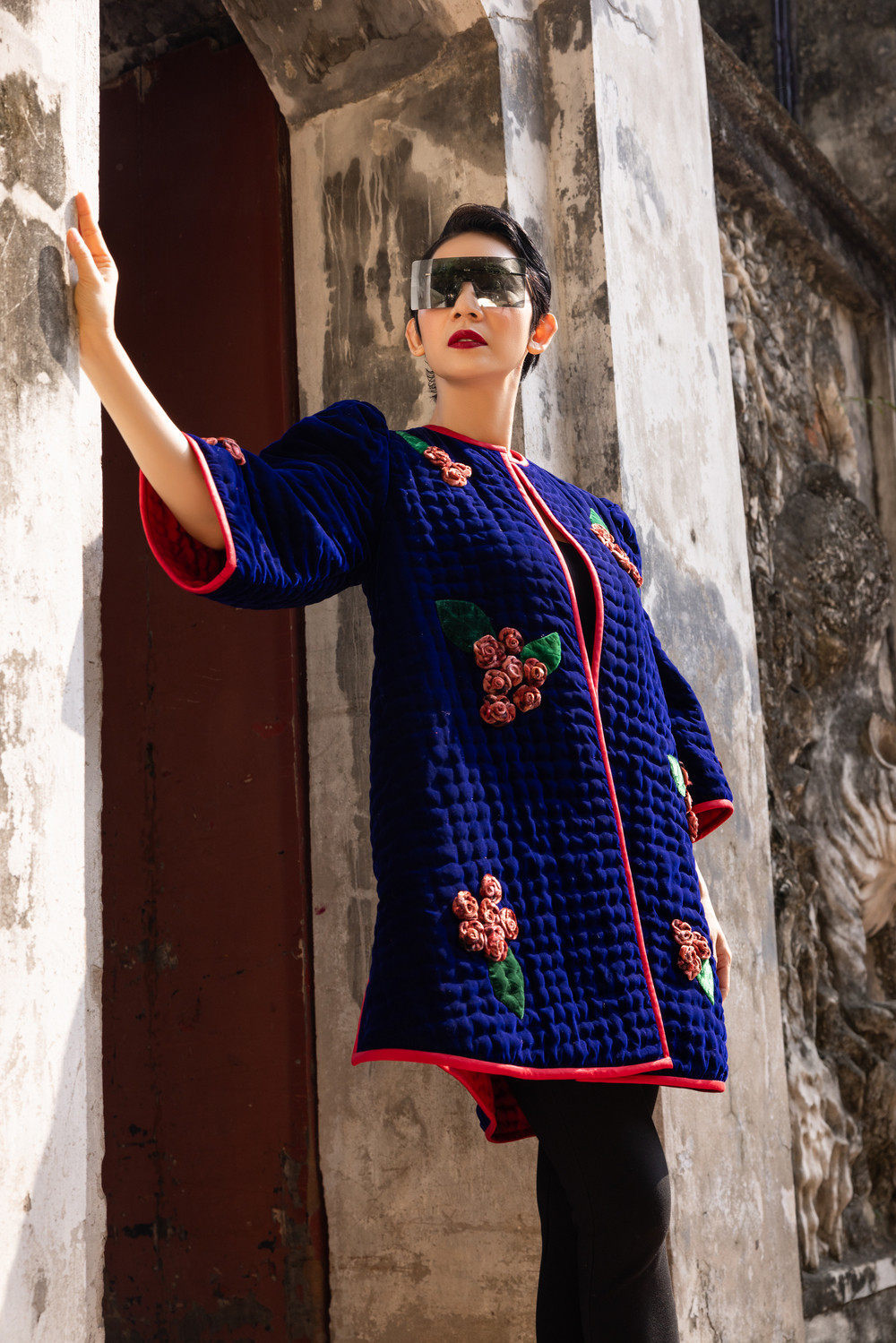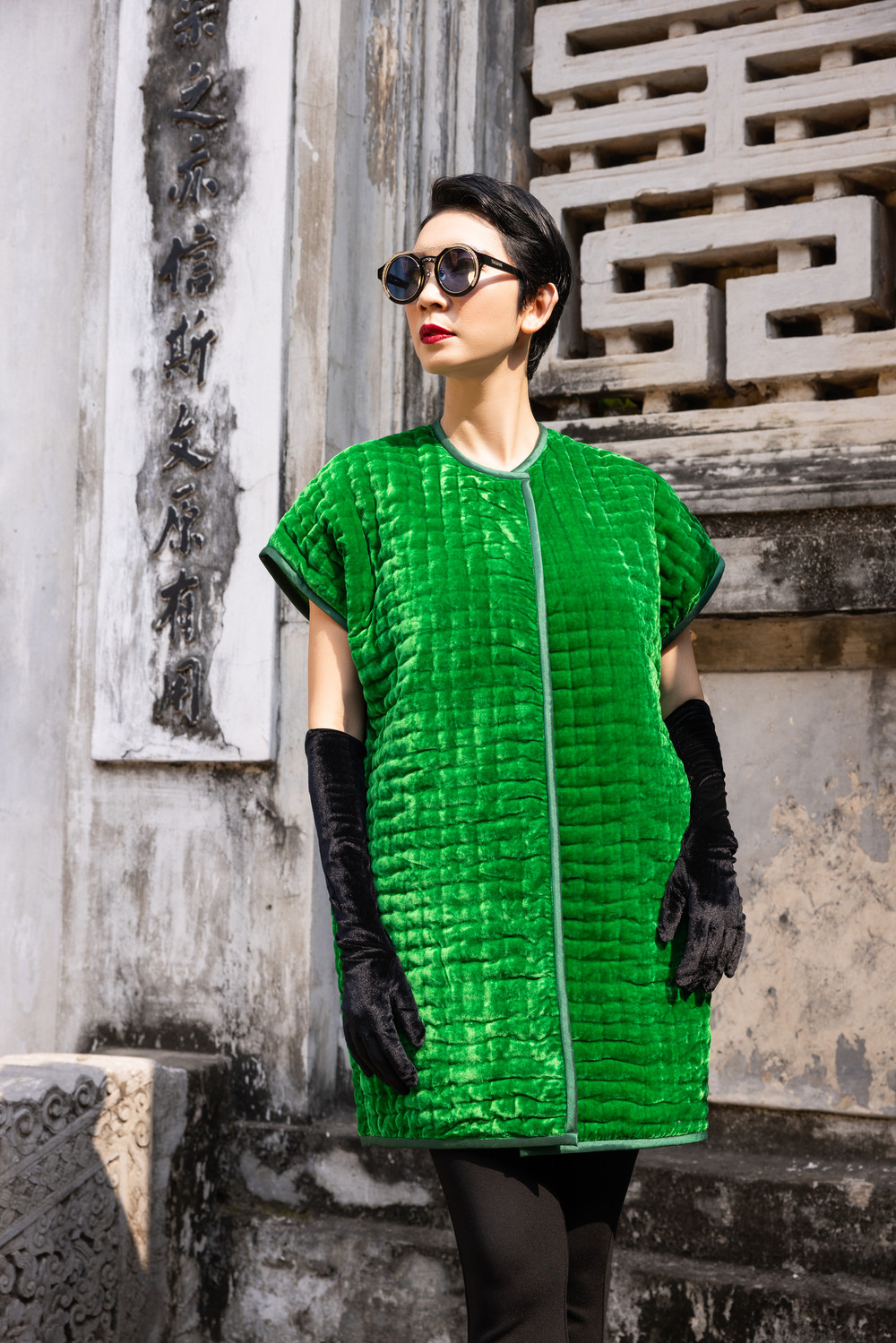 BST được NTK sử dụng nhung the, lụa tơ tằm - là những chất liệu quý mang hồn dân tộc suốt chiều dài lịch sử. Anh thổi hồn vào trang phục những đường nét phá cách để chiếc áo chần bông trở nên hiện đại.