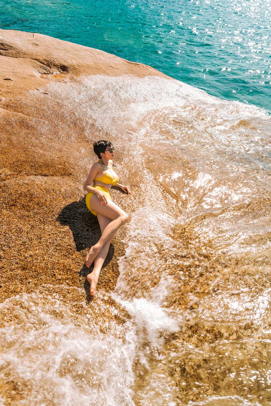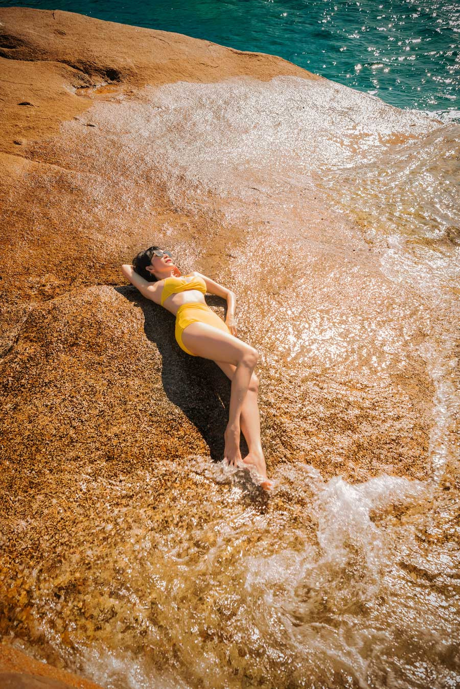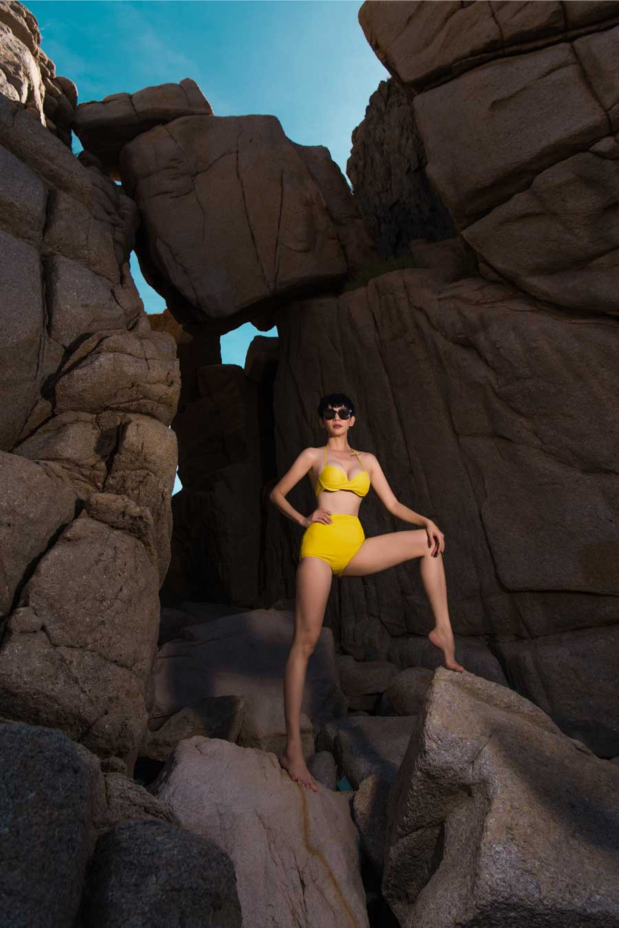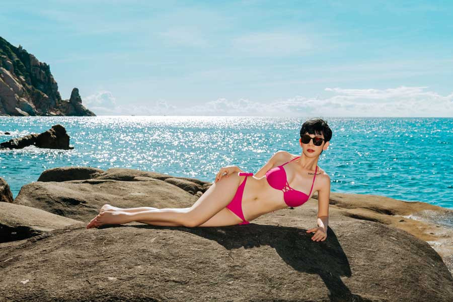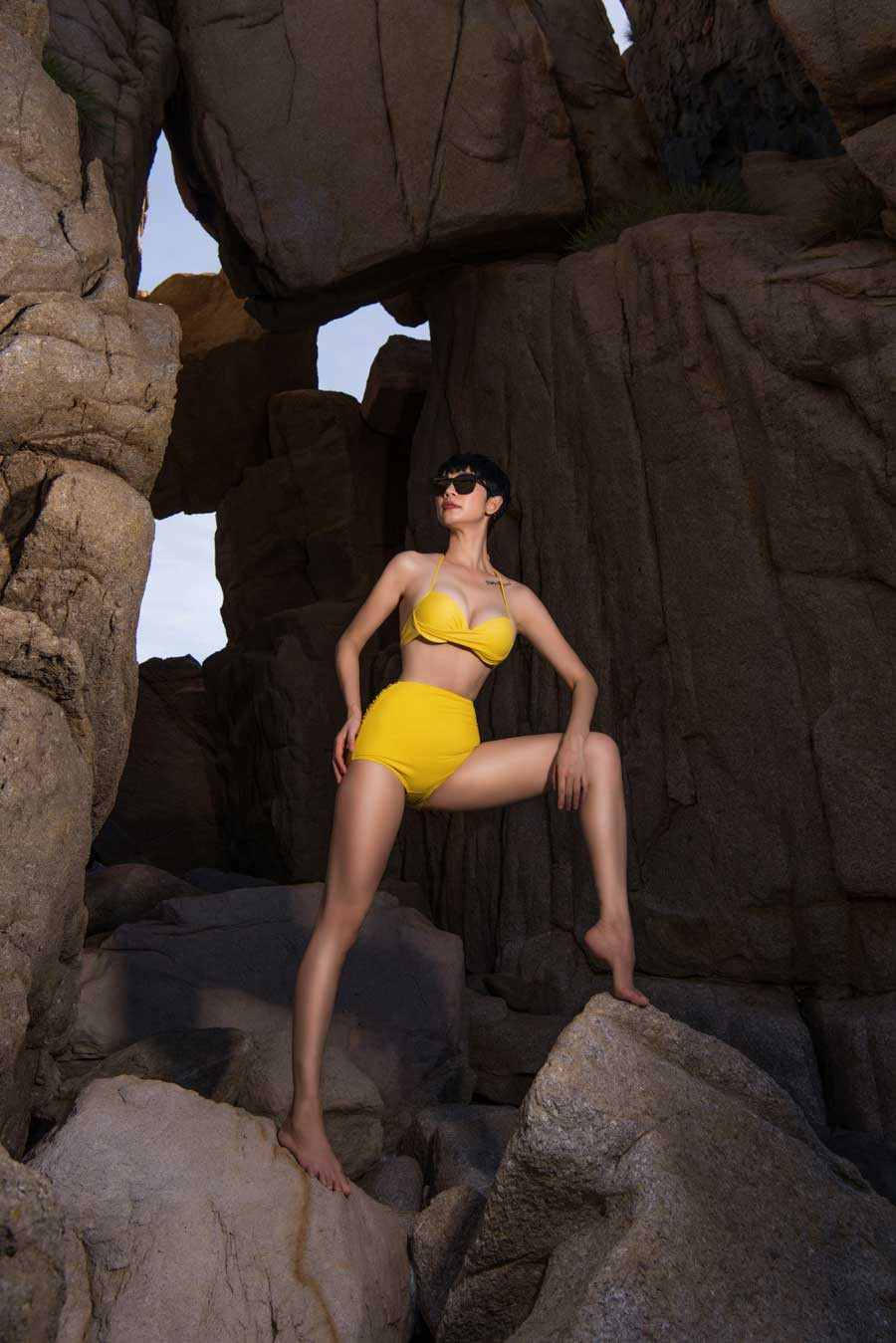 Sử dụng bikini 2 mảnh màu hồng đậm và vàng, nữ huấn luyện viên chương trình Quý ông hoàn mỹ cuốn hút với thần thái cực ngầu. Ngoài việc tập luyện thì chế độ dinh dưỡng cũng góp phần quan trọng cho việc giữ gìn vóc dáng của nữ siêu mẫu.