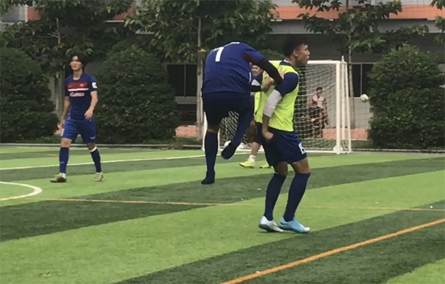 Bất bình với điều này, Quế Ngọc Hải liên tục phản đối với "trọng tài" là trợ lý Dương Minh Ninh. Cũng không vừa, Xuân Trường đã lao vào đạp đàn anh khi bóng rời sân.