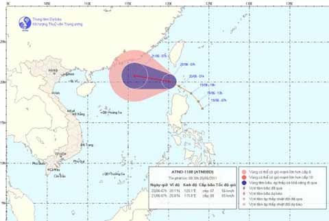 Theo tin mới nhất từ Trung tâm dự báo Khí tượng Thủy văn Trung ương, hồi 7 giờ sáng nay, vị trí tâm áp thấp nhiệt đới ở vào khoảng 20,1 độ Vĩ Bắc; 120,1 độ Kinh Đông, cách đảo Lu - Dông (Philippin) khoảng 180 km về phía Bắc Tây Bắc. Sức gió mạnh nhất ở vùng gần tâm áp thấp nhiệt đới mạnh cấp 7 (tức là từ 50 đến 61 km một giờ), giật cấp 8, cấp 9.