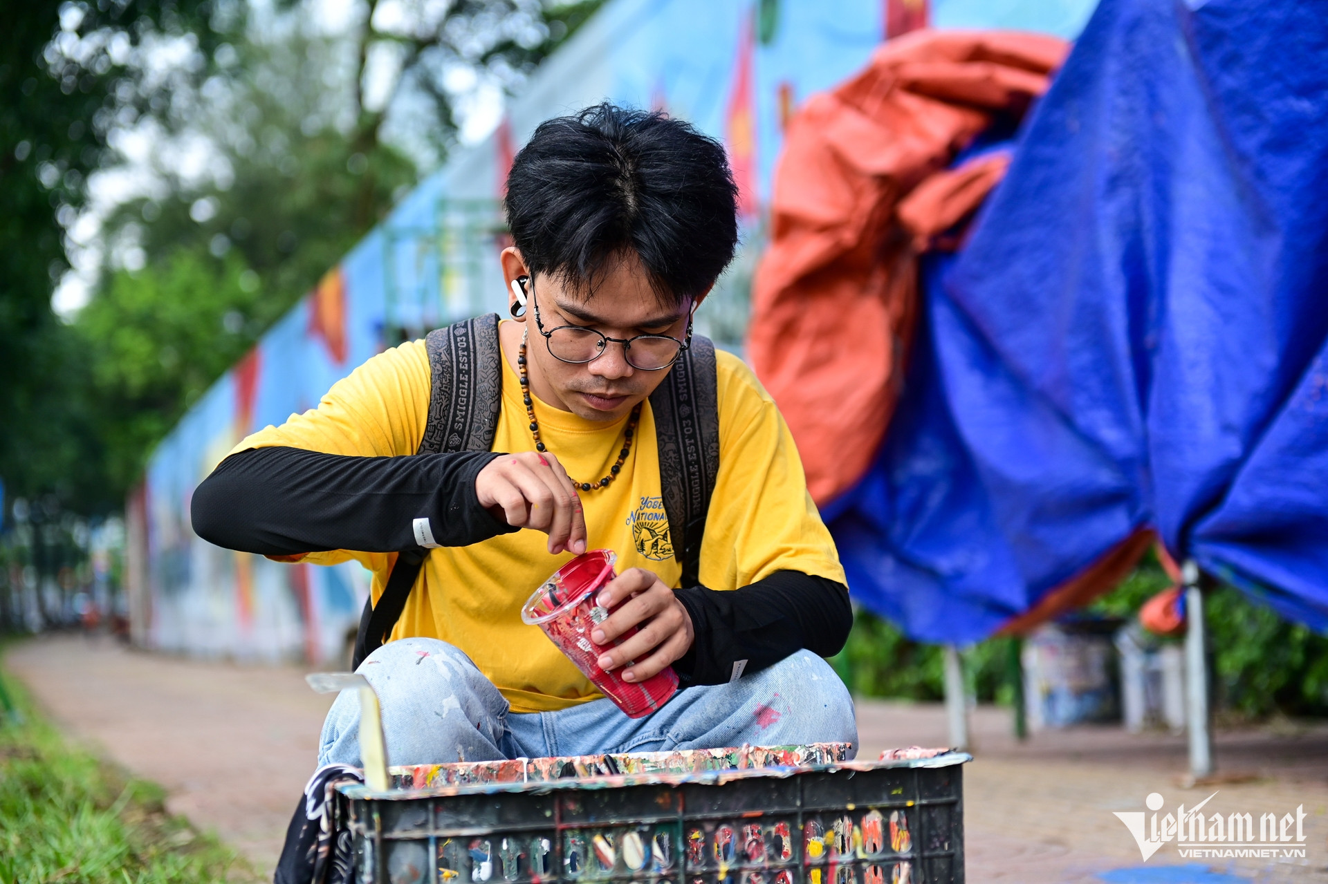 Khoảng 20 họa sĩ tham gia dự án, chia ca làm việc từ sáng đến chiều. Mỗi ca từ 6-10 người, tùy vào tiến độ và điều kiện thời tiết.